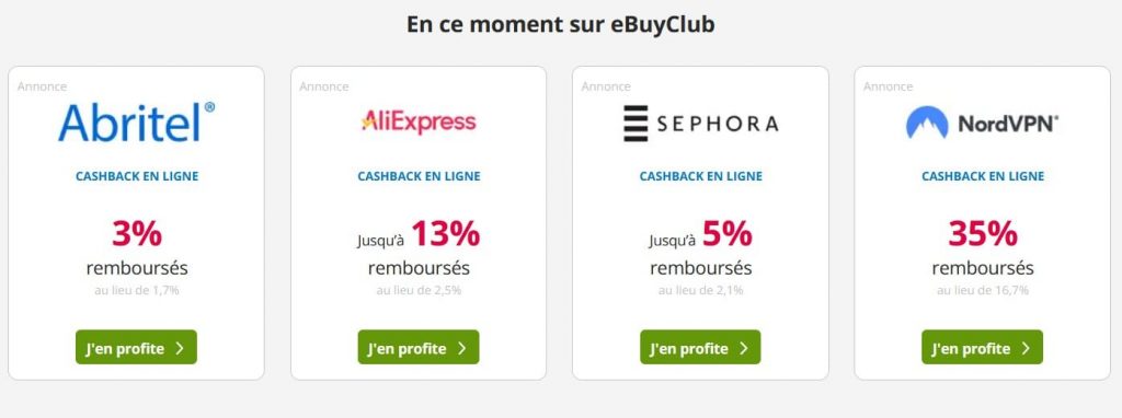 MàJ 07/2025 : eBuyClub propose désormais le cashback sur carte bancaire dans plusieurs grandes enseignes dont Carrefour, Intermarché ou Auchan.